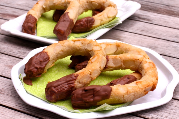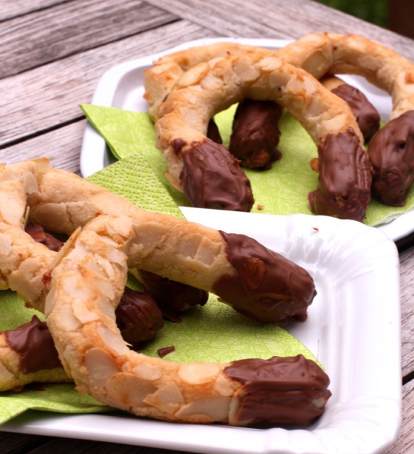Wenn die Mandelhörnchen abkühlt sind, diese in Kuvertüre tunken und kurz warten bis die Kuvertüre angezogen ist.