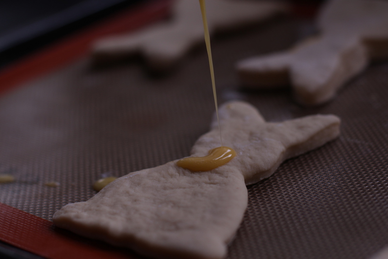 Als Nächstes den Teig auf einer gut bemehlten Oberfläche ausrollen und die Hasen ausstechen.