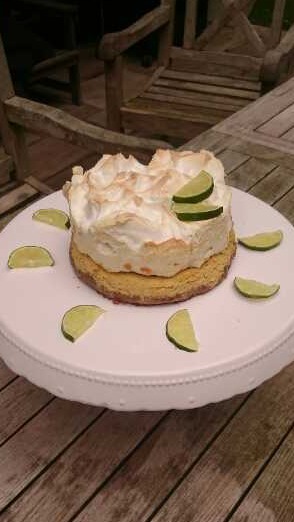 Die Masse auf dem abgekühlten Kuchen verteilen. Mit einem Flambierer das weiche Baiser leicht flambieren.