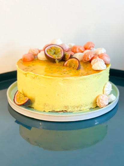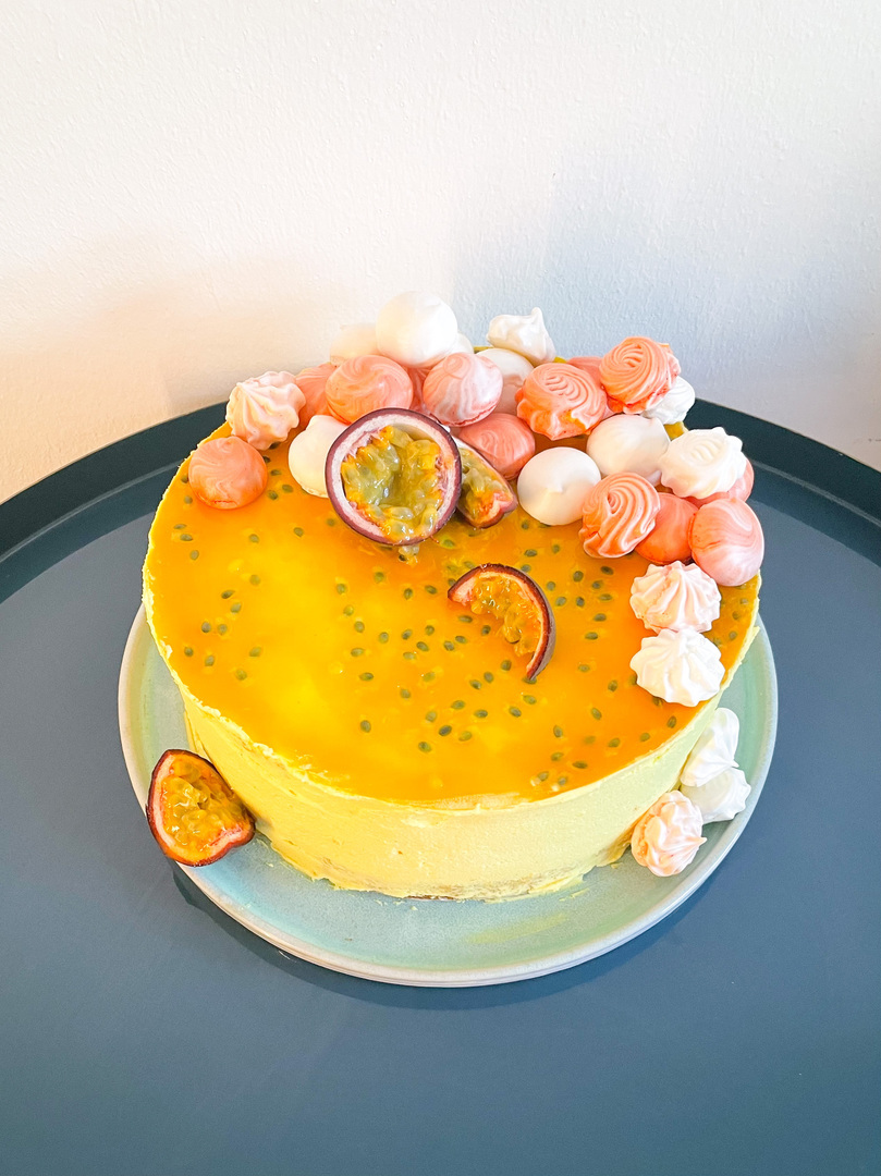 Vor dem Servieren kann die Torte nach Belieben mit Baiser und Passionsfrüchten dekoriert werden.