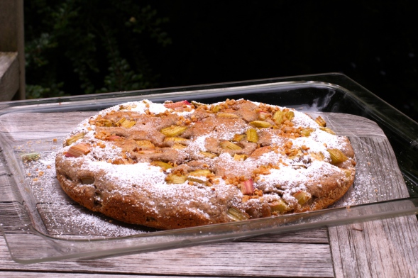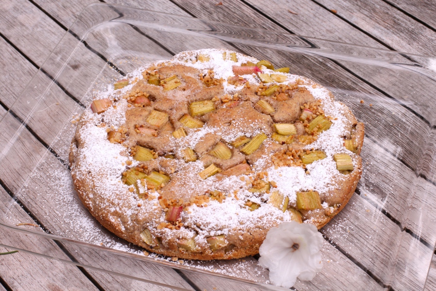 Als Letztes den vorbereiteten Rhabarber auf dem Teig verteilen und leicht in den Teig drücken.