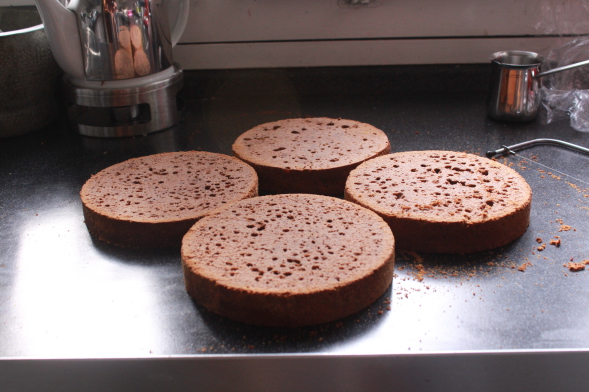 Den abgekühlten Kuchen in vier gleich dicke Böden teilen.
