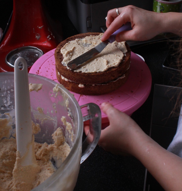 Ca. 2 Drittel der Creme auf den Böden verteilen, und die Böden aufeinander setzen. Mit der restlichen Creme die Torte einstreichen und kühl stellen.