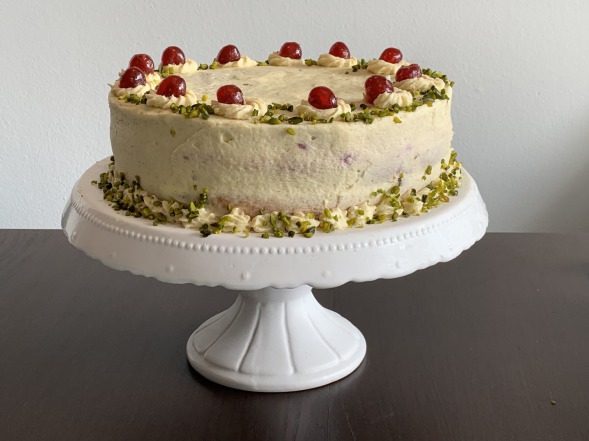 Je nach Geschmack die Torte mit Cremerosetten, kandierten Kirschen und Pistazien dekorieren.